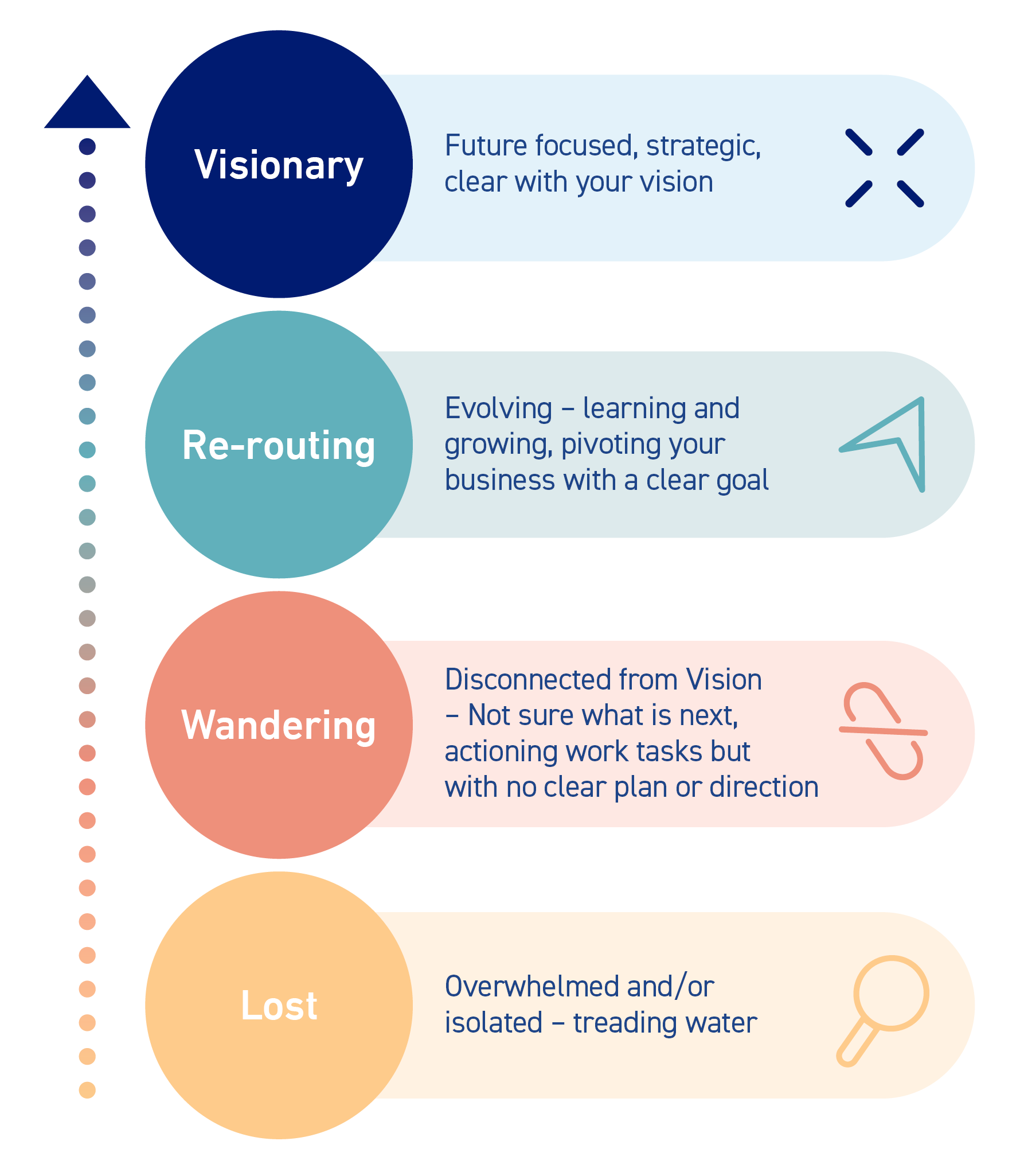 Designed for small business owners, this insightful tool helps identify your current profile—Visionary, Re-routing, Wandering, or Lost and provides strategic feedback and a starting point.